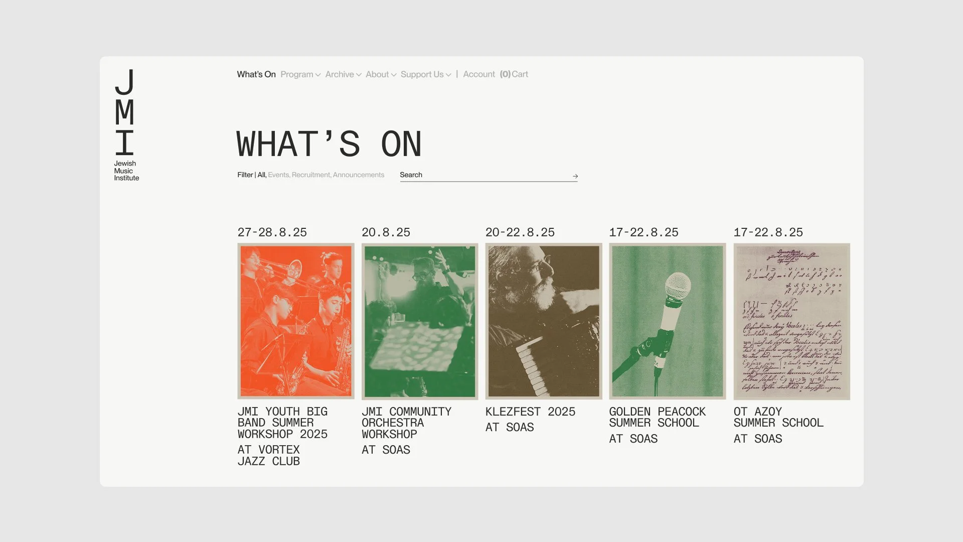 With a new and ambitious CEO, the Jewish Music Institute approached us to reshape their identity in step with a wider shift: how to honour a legacy without being defined by it, and how to carry heritage forward as a platform for what comes next. We developed a modern identity system that translates archival cues, including typography and image treatment, into a flexible framework for contemporary programming, new audiences, and a clearer public presence.
